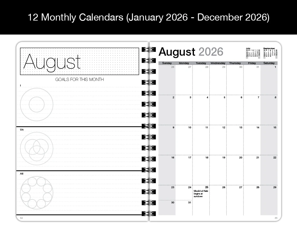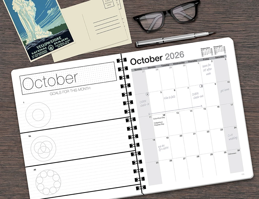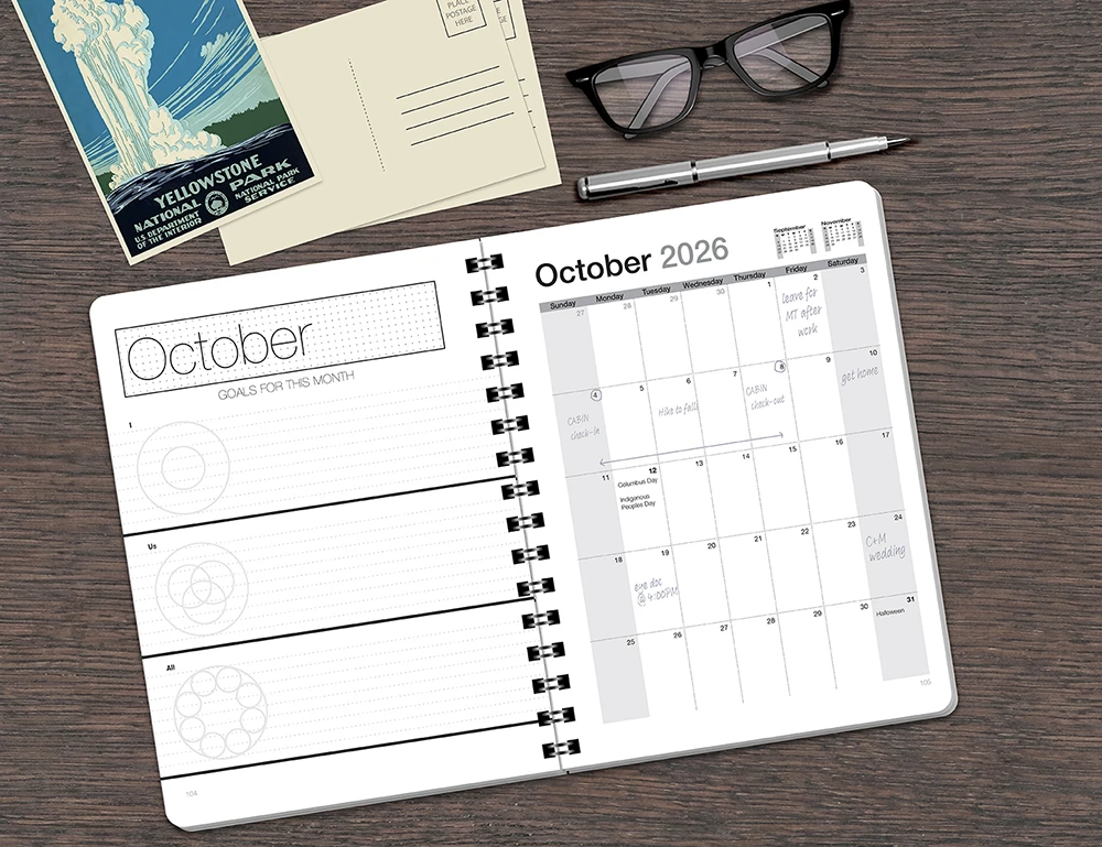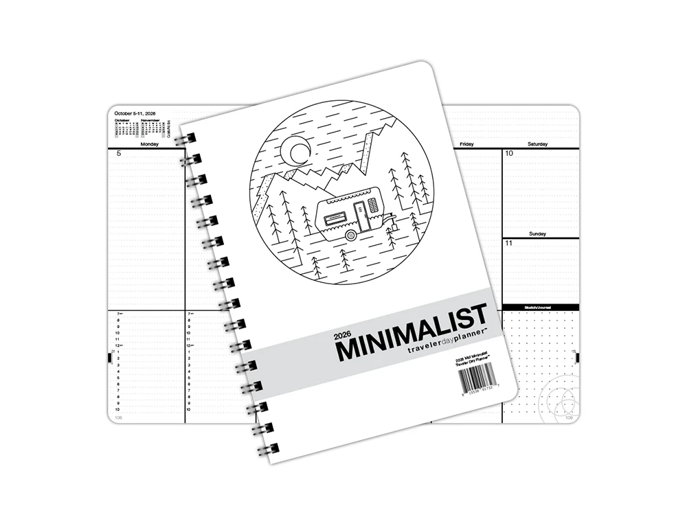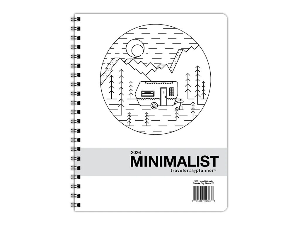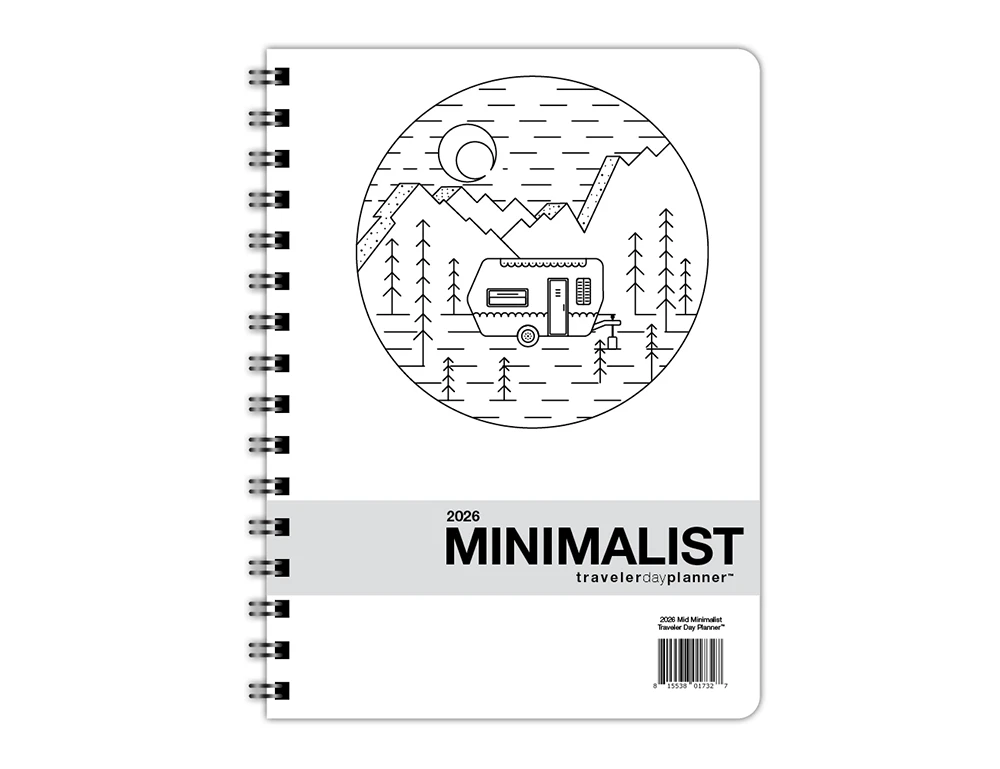 Designed for minimalists. Minimalists who also love to travel. This simplified planner design features more room for writing and offers less visual distraction to aid in focusing on what’s important. It’s the perfect fit to plan your minimalist lifestyle. Start your day, your week, and your year with a plan of action to set personal goals, and manage and plan your time. Heavy duty double loop lay flat wire binding and rugged covers hold up to heavy use. Rigid back cover for table-free stand-alone use. 144 pages, 12 months (January – December). Made in the USA.