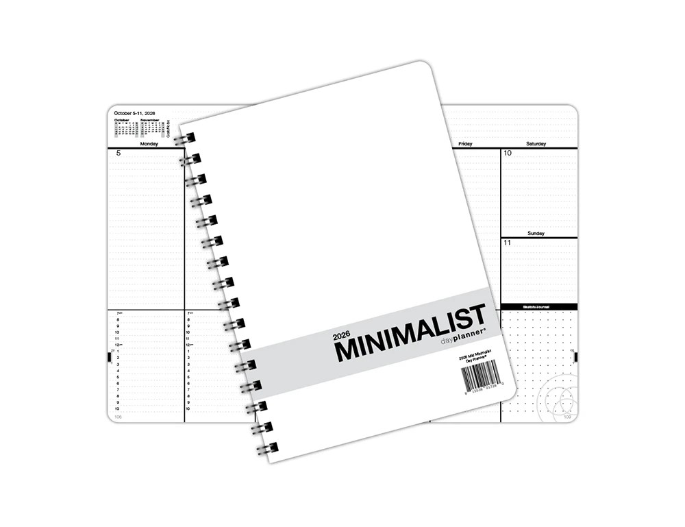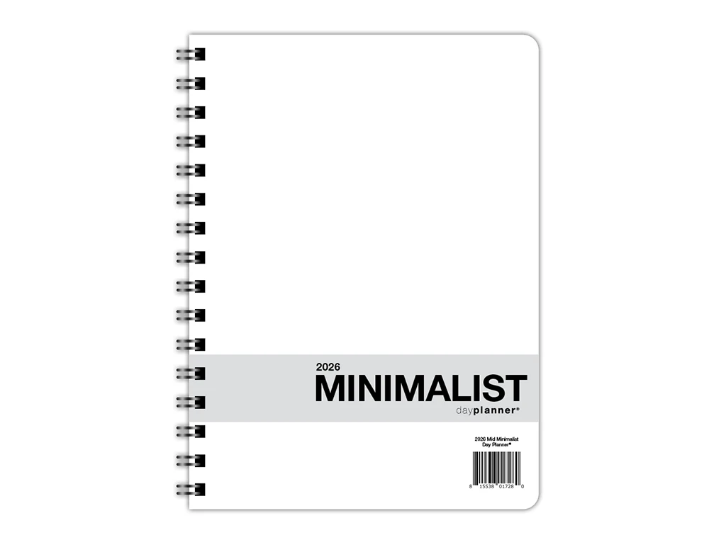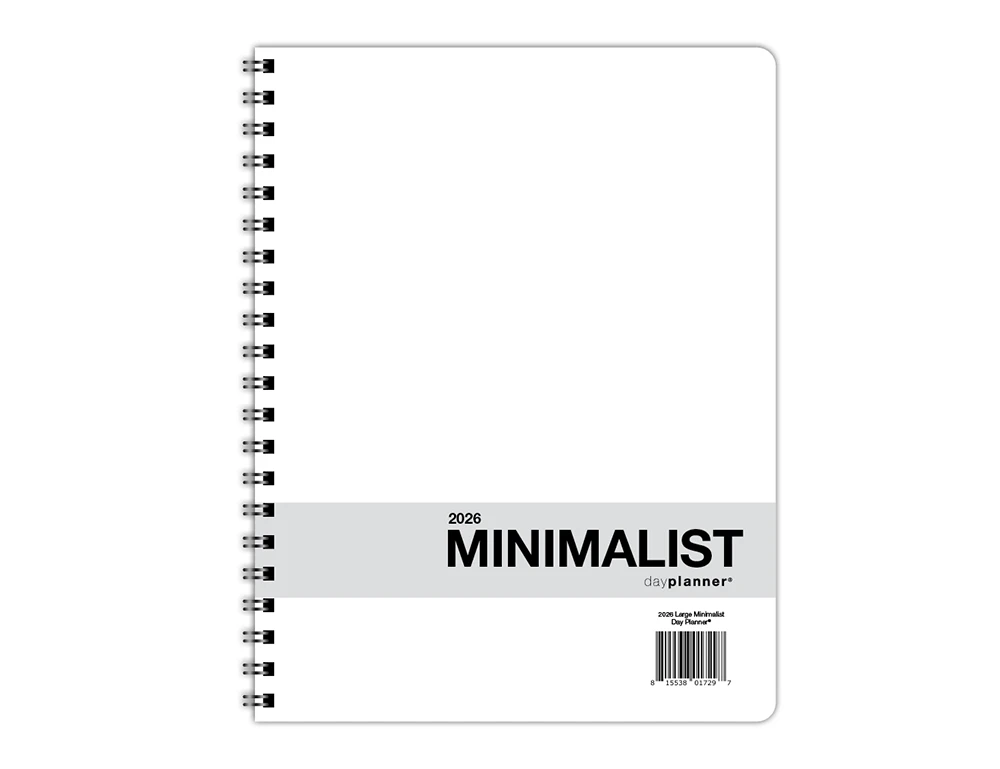 Clean simplicity. Clutter-free design. The 2026 Minimalist DayPlanner offers minimal visual distraction with a fresh sense of design and is easy to read and write in. This perfectly sized agenda offers 148 pages of smooth white paper and is wonderfully crafted. With a protective front and back clear poly cover and a rigid chipboard backing for table-free writing, this planner is ready to take on the toughest of planners. Clear your mind and focus on what’s really important with the Minimalist Annual Day Planner. Made in the USA.